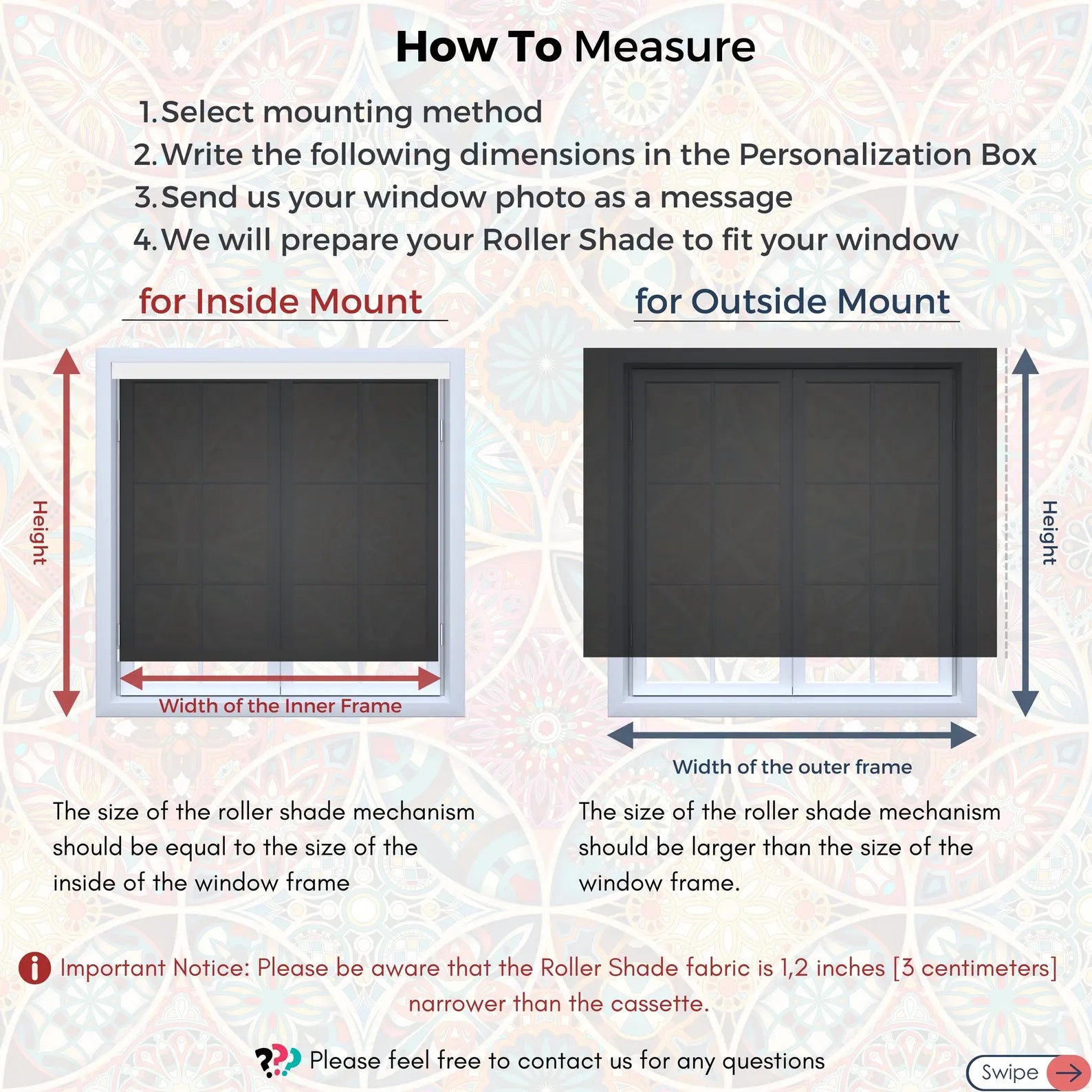 We can customize the width and length of your shade according to your desired dimensions. Simply measure your window's dimensions, take a photo if possible, and get in touch with us. We'll handle the rest