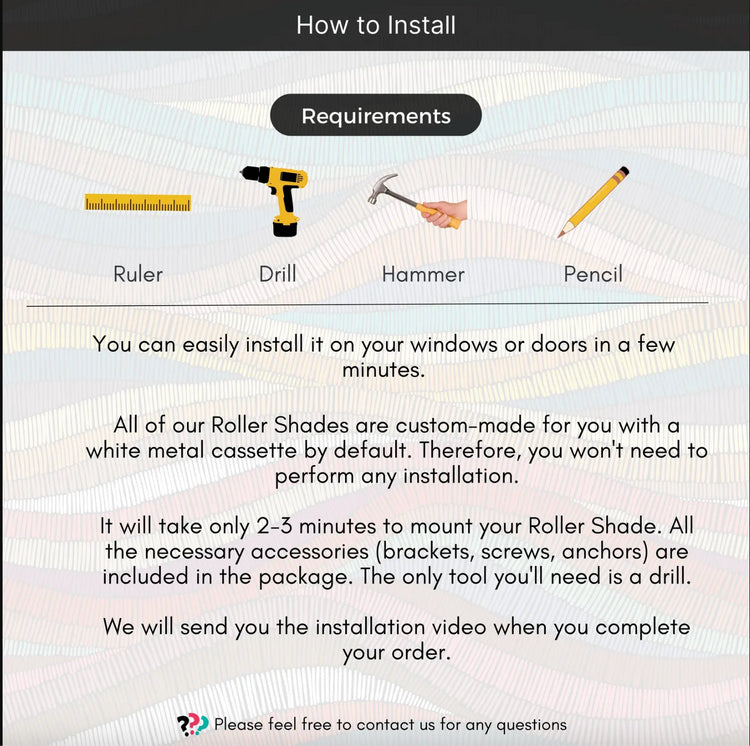 All our Roller Shades are prepared with a white metal cassette and require no installation. All you need to do is take a few minutes to mount your Roller Shade to your window/door.