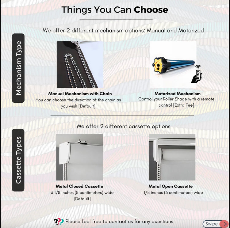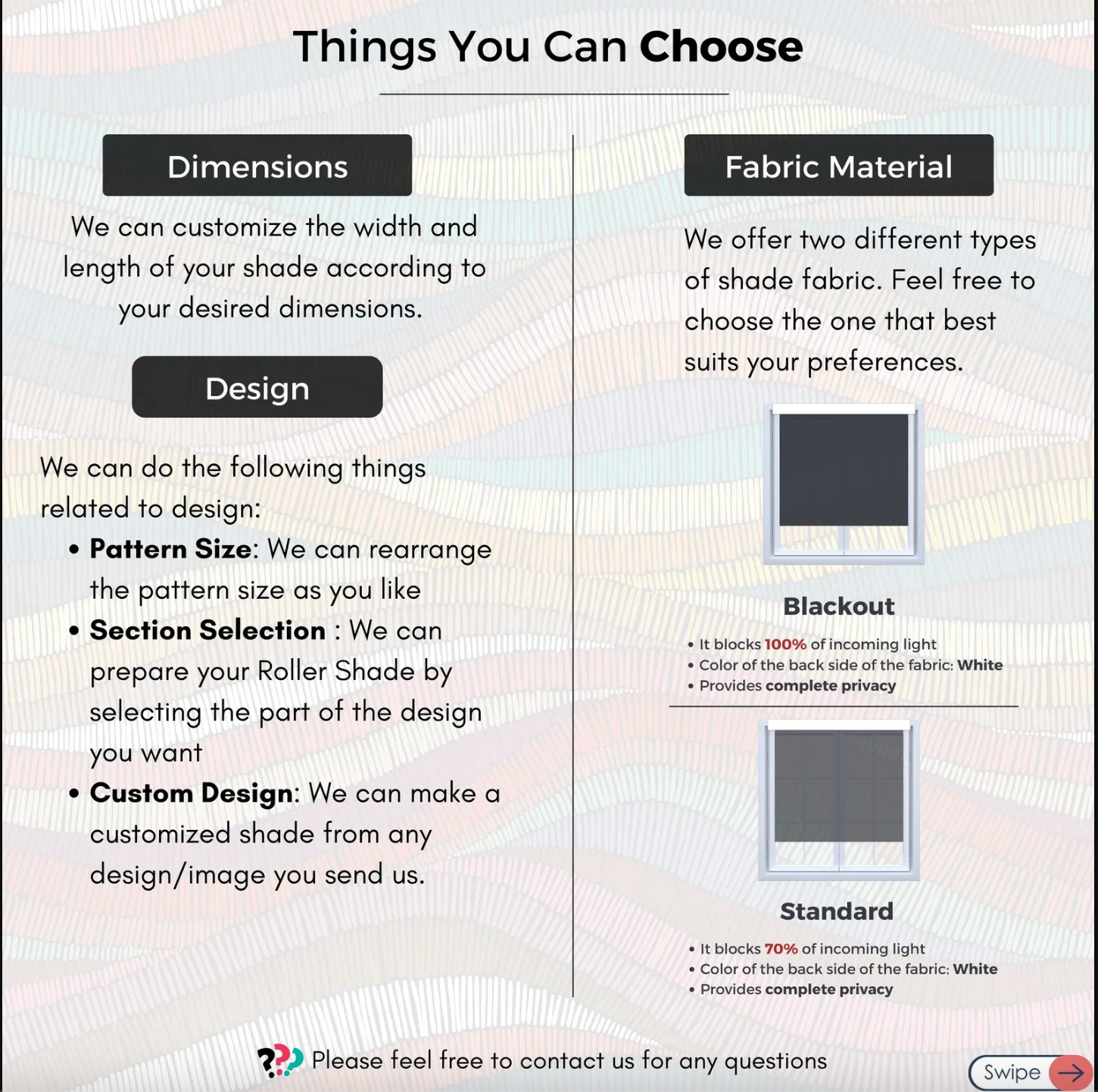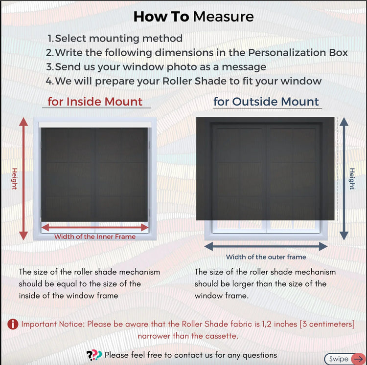 We can customize the width and length of your shade according to your desired dimensions. Simply measure your window's dimensions, take a photo if possible, and get in touch with us. We'll handle the rest